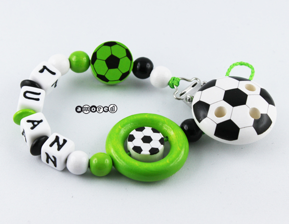 Schnullerkette Holz *Fussball & Ring gelbrün-schwarz* mit Namen