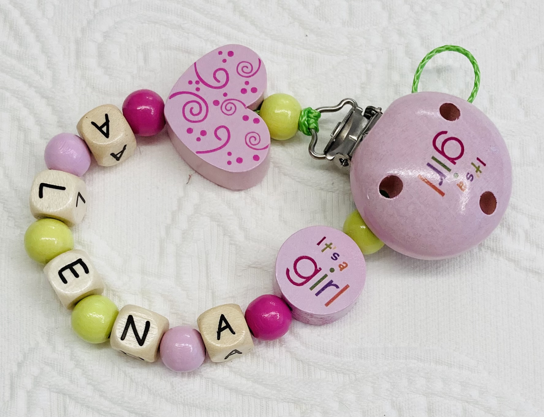 Schnullerkette Holz *It's a girl rosa-lemon* mit Namen