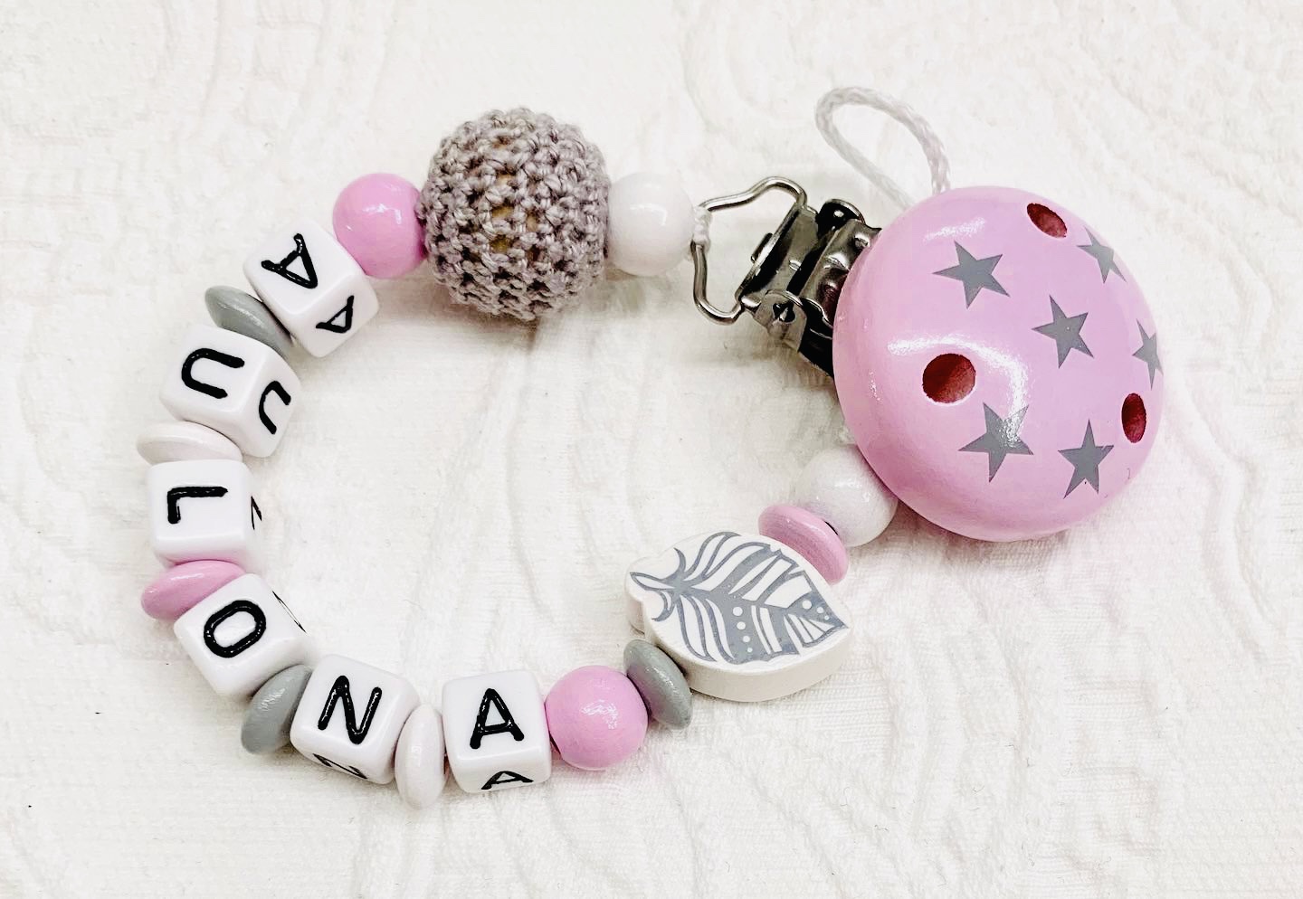 Schnullerkette Holz *Feder & Sterne rosa-grau* mit Namen