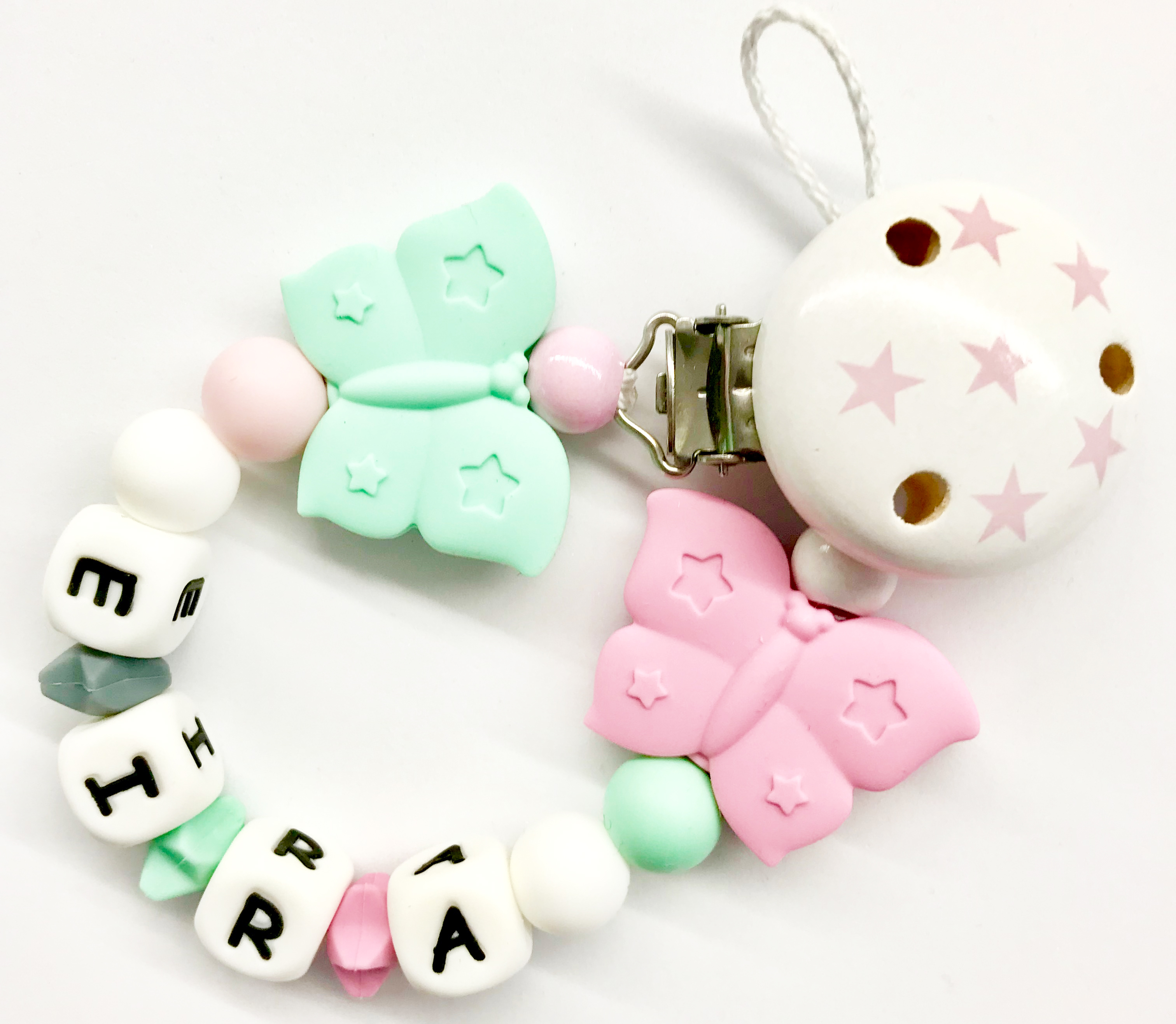 Schnullerkette Silikon *Schmetterlinge pastellrosa-mint* mit Namen