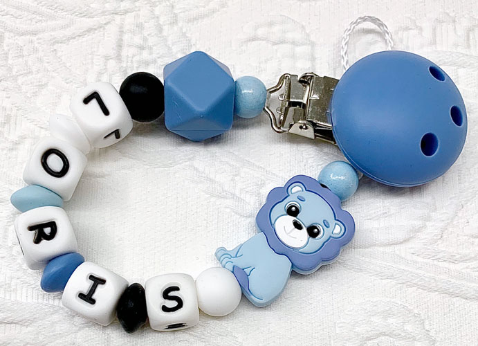 Schnullerkette Silikon *Löwe eisblau-pastellblau* mit Namen