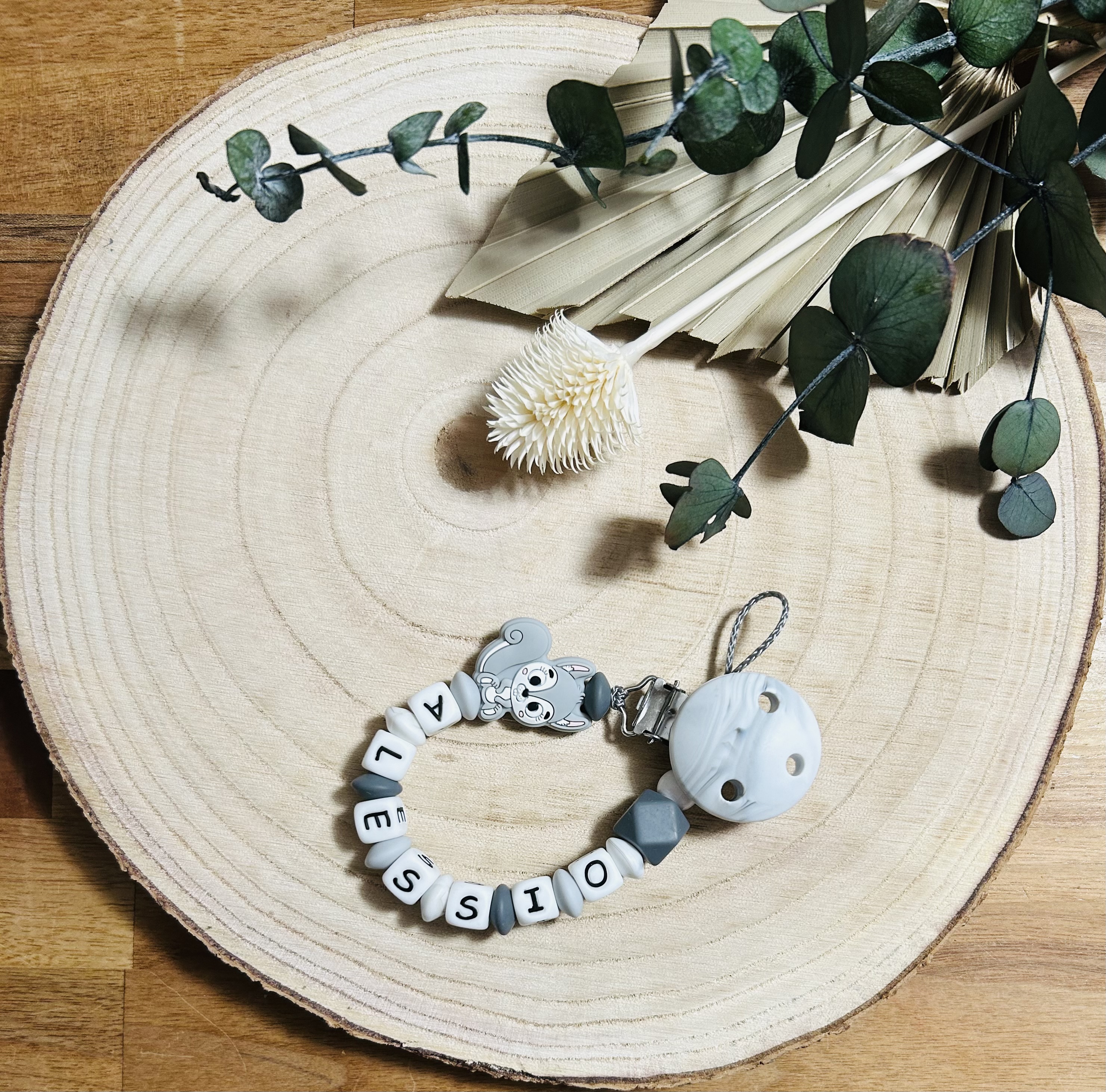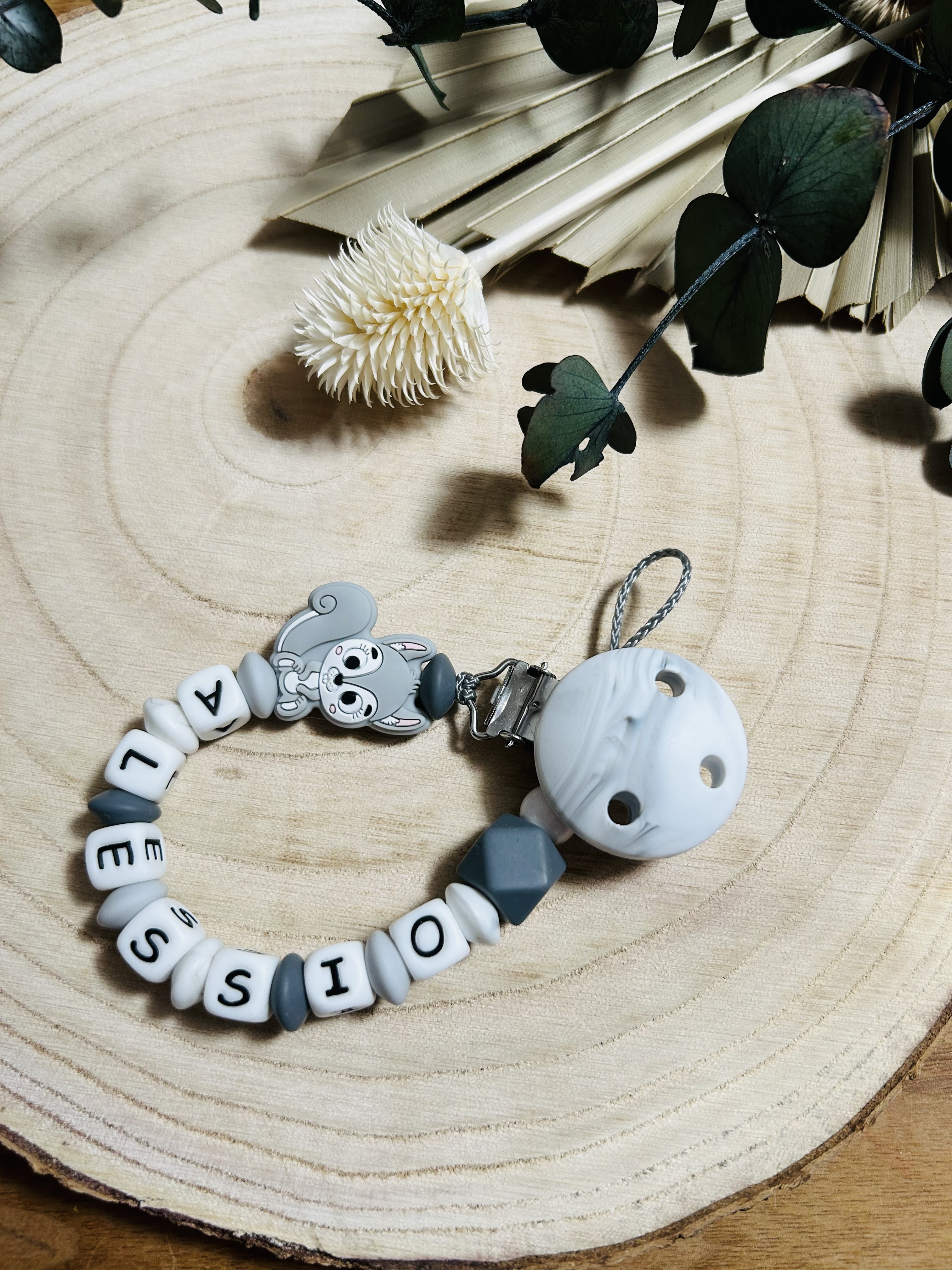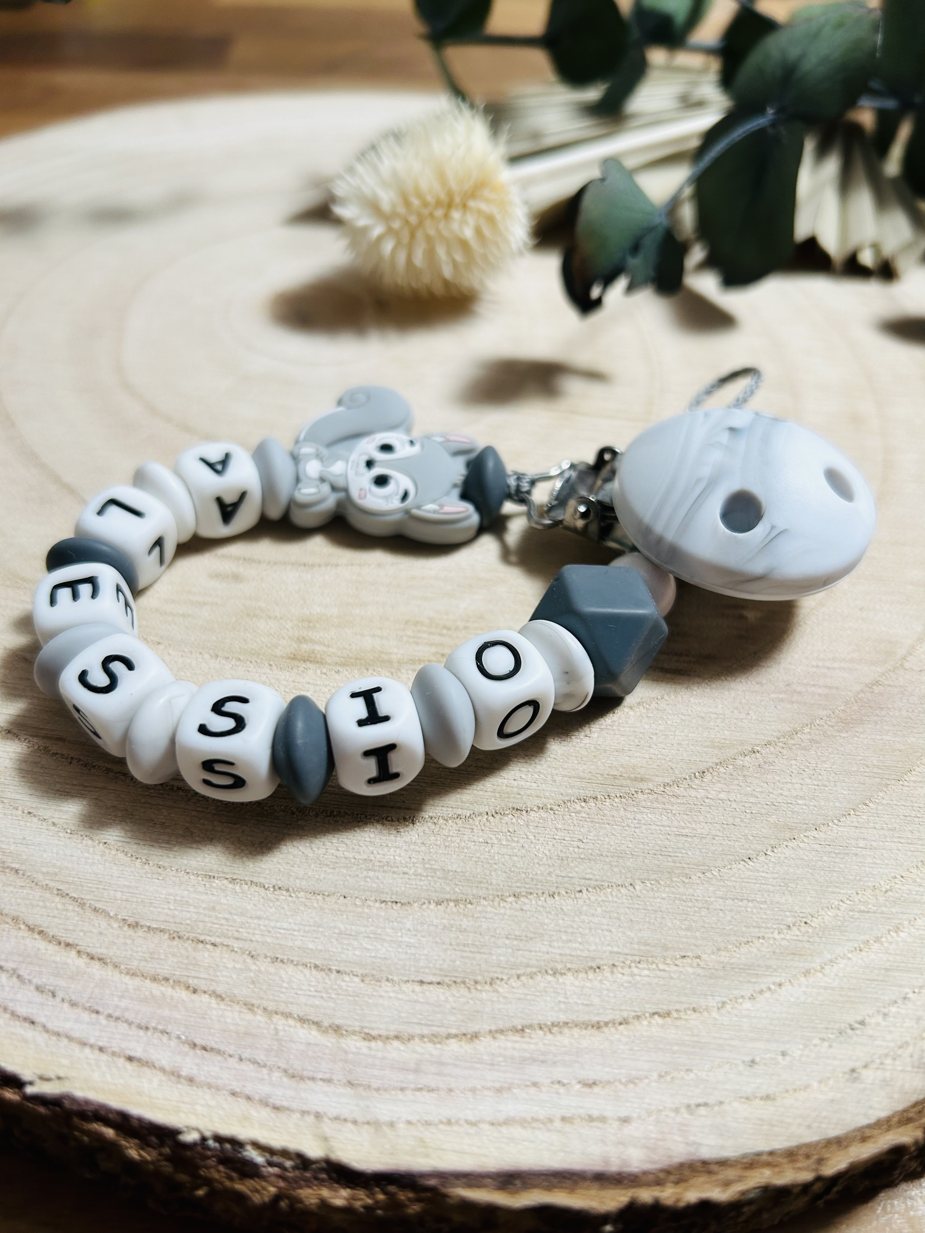 Schnullerkette Silikon *Eichhörnchen hellgrau-marmor* mit Namen
