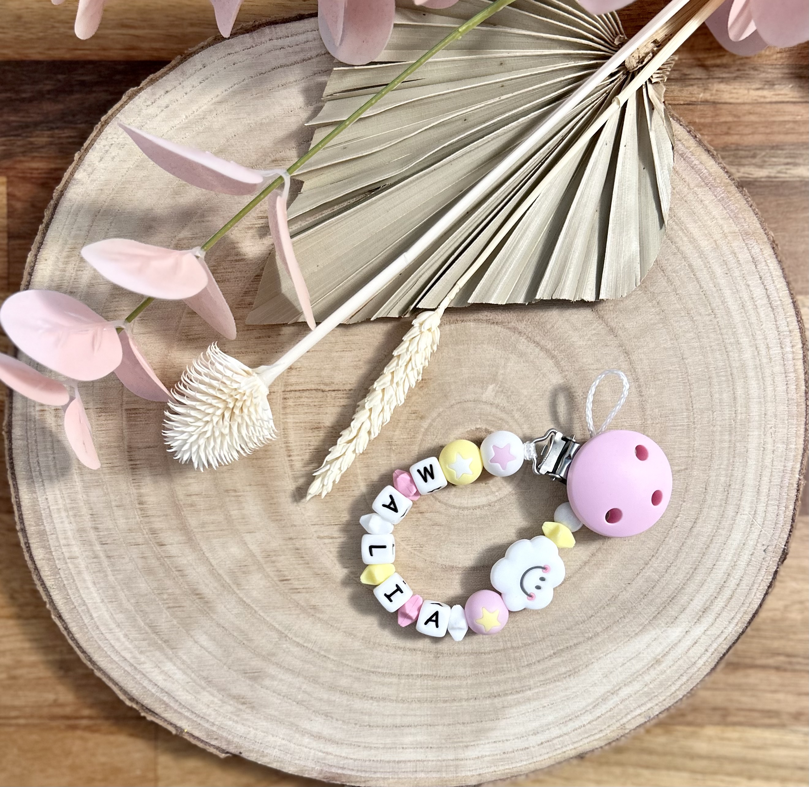 Schnullerkette Silikon *Wolke & Stars pastellgelb-pastellrosa* mit Namen