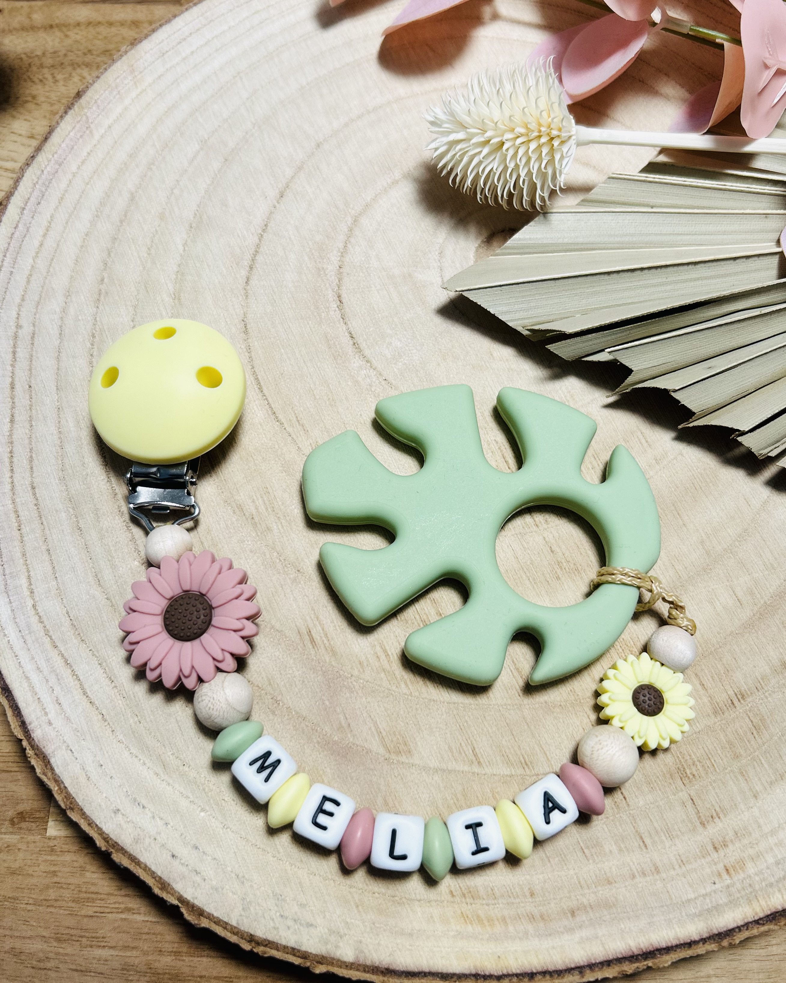 Beisskette Silikon *Blatt Tropical Aloe vera-blush* mit Namen