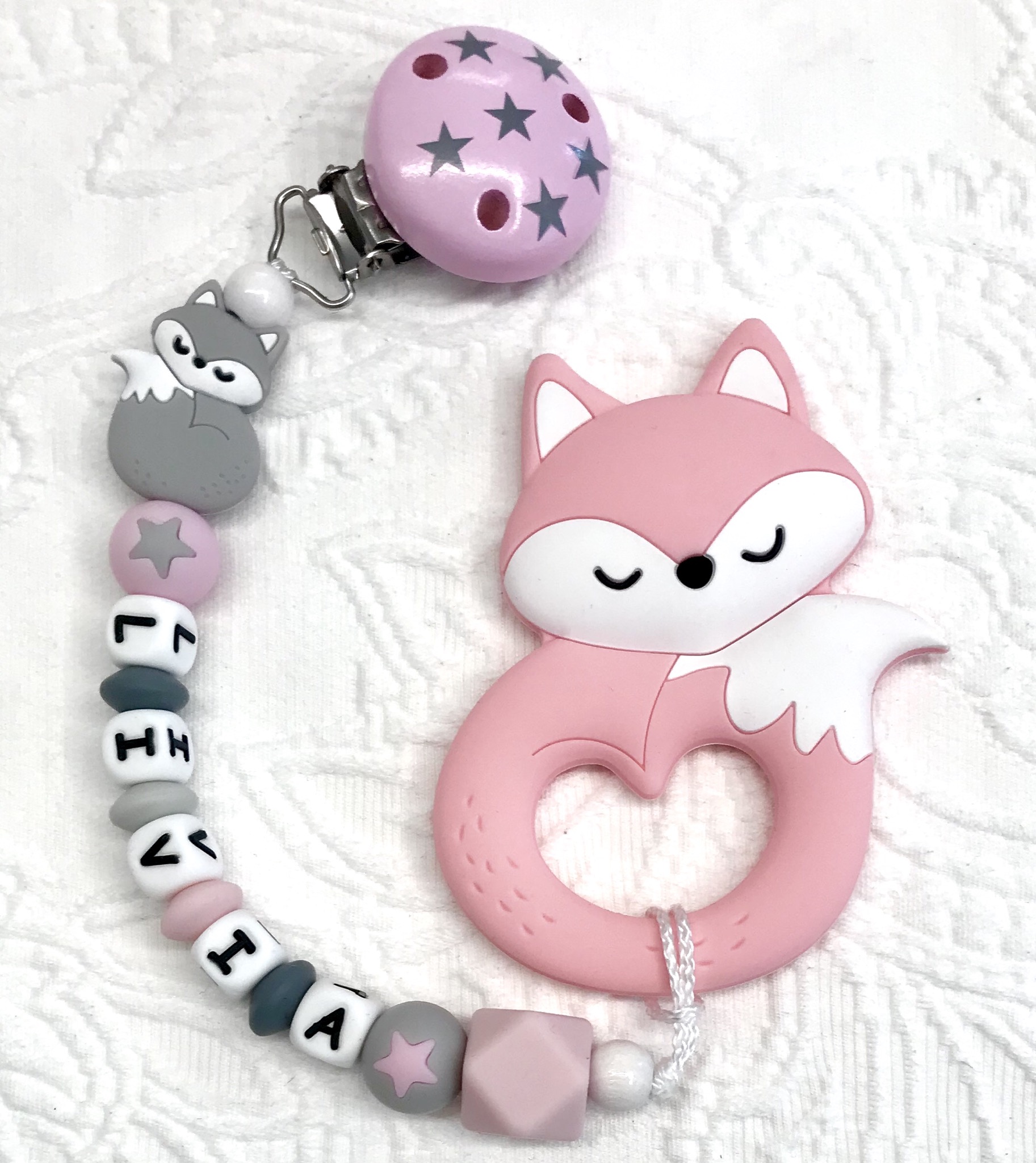 Beisskette Silikon *Sleepy Fox Pastellrosa-hellgrau* mit Namen